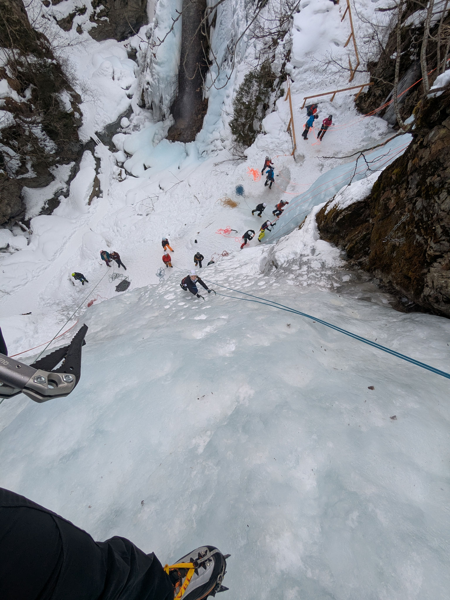 Ausbildungsinhalte sind zudem das Setzen von Eisschrauben, Abseilübungen, sowie das Einrichten eines Toprope.