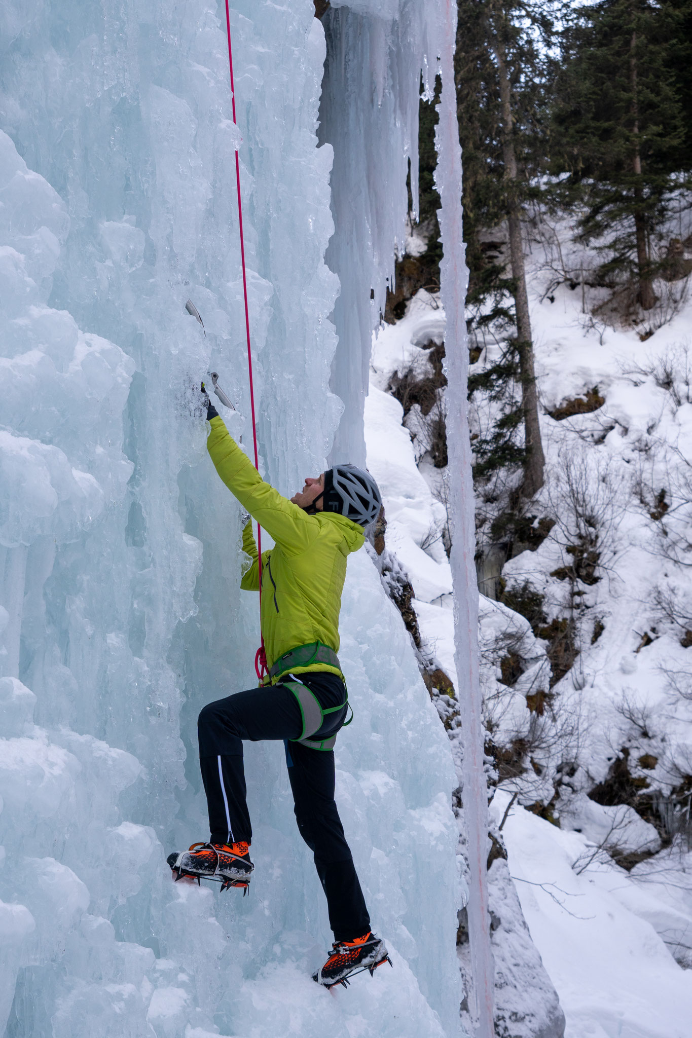 Angefangen von ersten Toprope Seillängen im Eis, lernst Du bei uns auch die Frontalzackentechnik und gute Schlagtechnik mit den Eisgeräten.